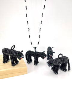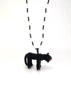 El Collar Pantera Nocturna es un ícono de elegancia y misterio. La figura de pantera, meticulosamente tejida en mostacillas negras por los Kametsa del Putumayo, transmite poder y sofisticación.